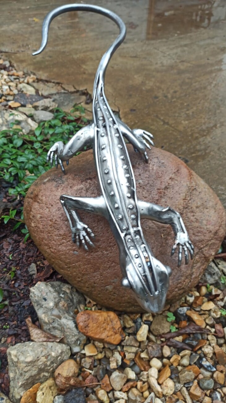 Фигурка ящерицы, ручная работа, внутри полая, но весьма тяжелая. Длина - 60 см, ширина 20 см, в холке 11 см. Зверюга! Предлагается в серебристом цвете, покрытая лаком. Каждая ящерица делается индивидуально, точное повторение невозможно, они будут немного разными.