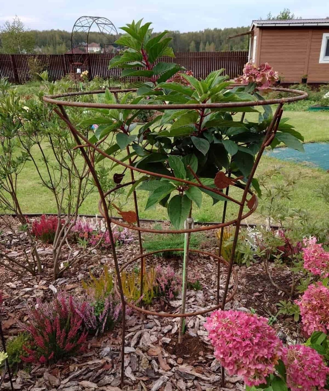 Стальной кустодержатель. Высота 150 см, диметр по верху 90 см. Годится для больших роз, гортензий, чубушников.