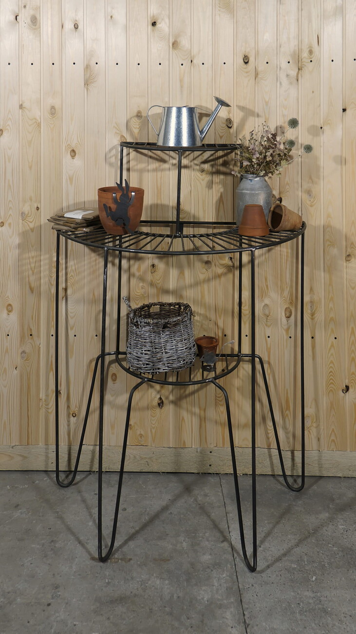 Элегантный полукругый стеллажик винтажного стиля. Высота нижней полки - 50 см, верхней - 30. Диаметр (по средней полке) - 100 см. Нагрузка на полку - до 30 кг. Цельносварная неразборная конструкция. Подходит для улицы и помещений.
