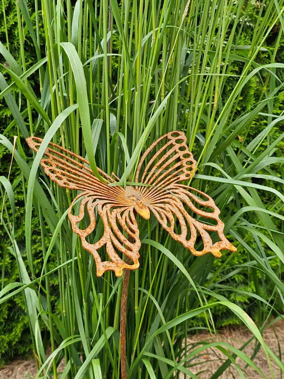 Довольно крупная ажурная бабочка, для украшения газона, клубмы. Сталь 2 мм, размер 20*25 см. (размер приблизительный) Высота ножки 150 см.