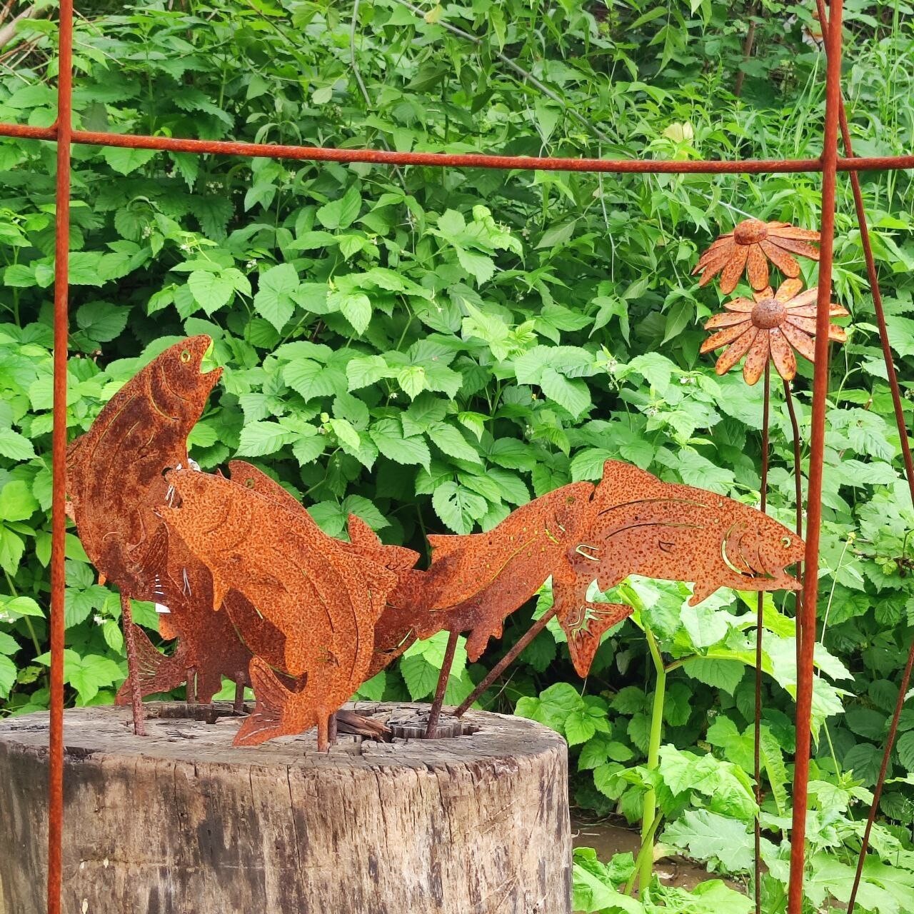 Комплект из четырех рыб. Все разные. Продаются только комплектом. Сталь 1 мм, размер в среднем 20*10 см, ножки по 40 см.