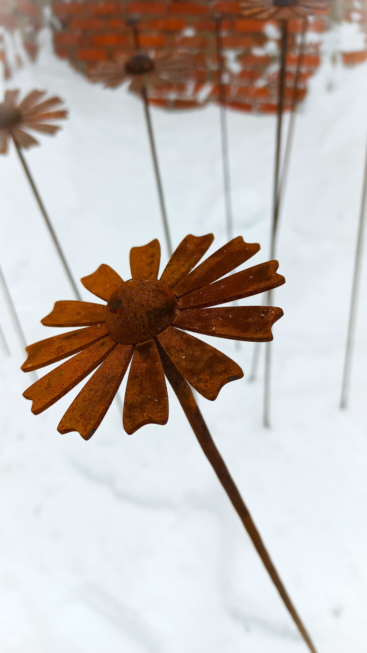 Крупная ромашка. Предлагается в трех размерах вариант 1 = диаметр цветка 10 см, вариант 2 = 12 см, вариант 3 = 15 см. Высота всегда 120 см. Ножка - стальной пруток 6 мм. Можно приобрести поштучно, или комплект из трех размеров.