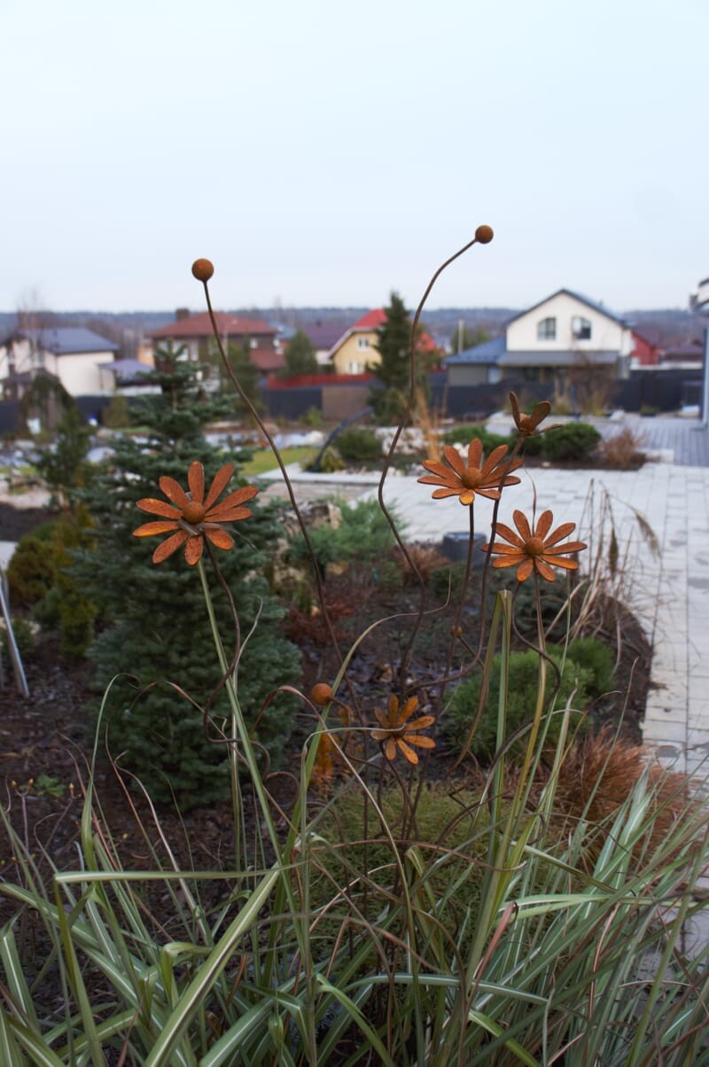 Казабра. Фантазийный цветок с выдуманным названием. Девять изогнутых стебельков с цветочками в разных стадиях роспуска. От бутонов-шариков до полностью раскрывшегося цветка. Высота 150 см от земли + ножки 30 см. Букет собран на одно основание с ножками в землю. Устанавливается просто. Воткните их в землю в нужном месте.